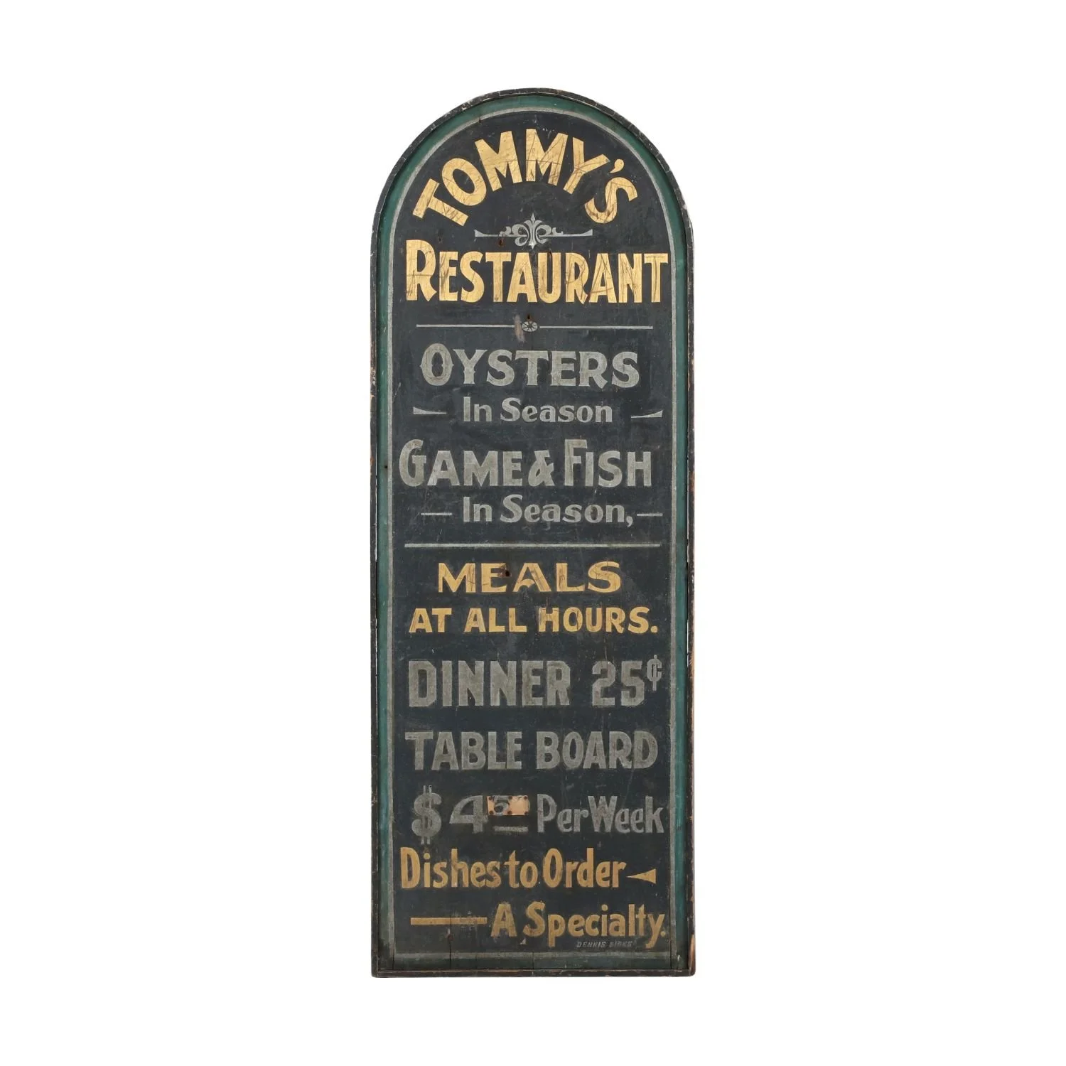 The top lot proved a textbook example of crossover appeal. Lot 13, the early 20th century tombstone-form pine sign for “Tommy’s Restaurant”, retained its untouched dry surface and original gold and silver lettering on a black smaltz ground. Signed “Dennis Signs,” the rare survivor soared well beyond its CA$2,000–CA$2,500 estimate to finish at CA$27,830, the highest price of the sale.